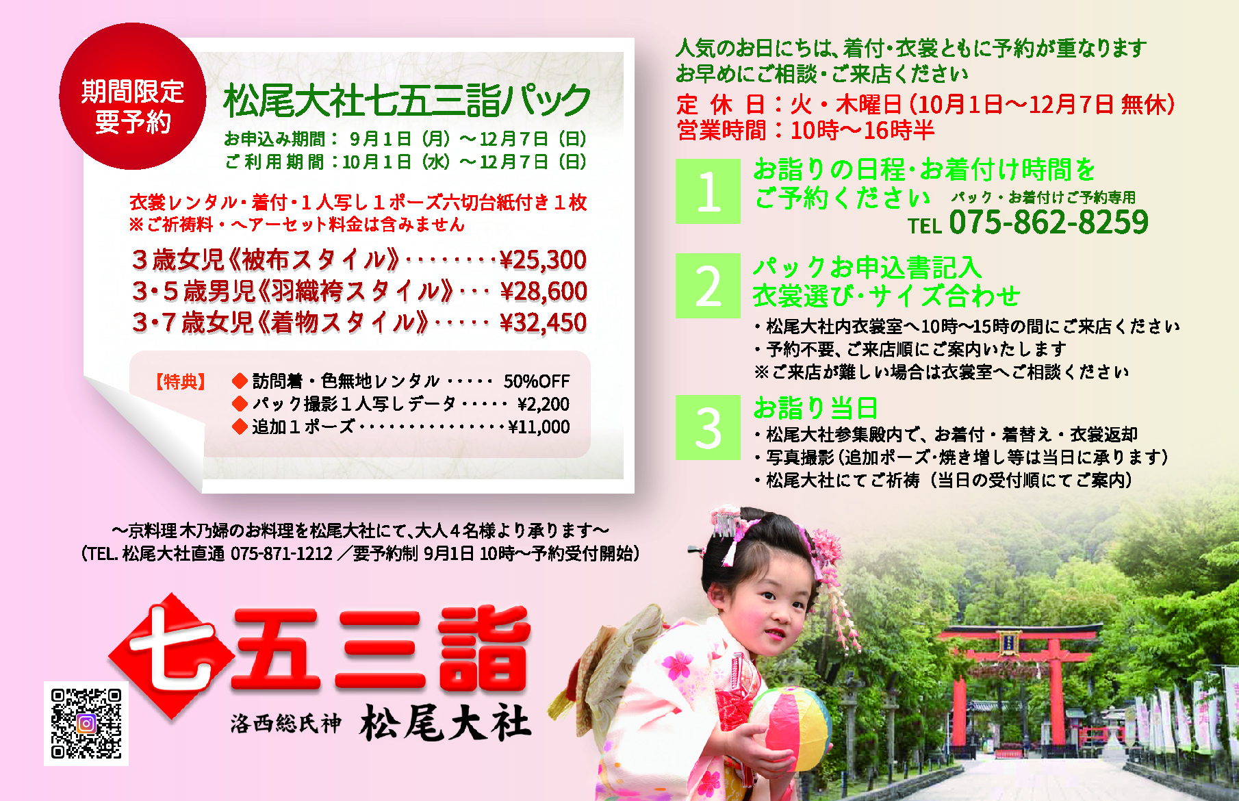 〈パック内容〉 ・七五三衣装のレンタル ・着付 ・1人写し1ポーズ六切台紙付き1枚